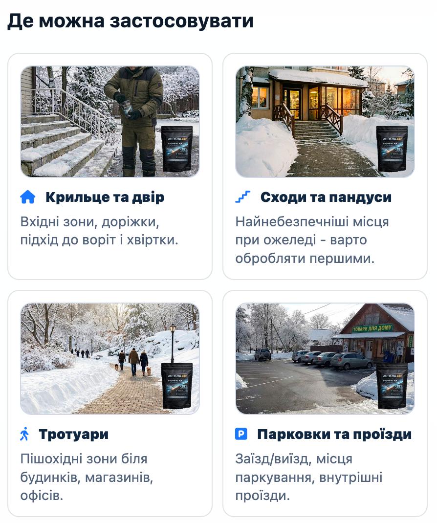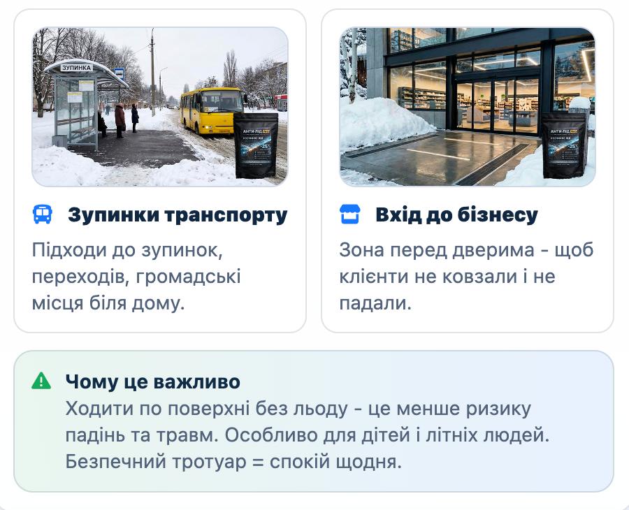 Підходить для дому, бізнесу та ОСББ. Коли слизько вже зараз — потрібне швидке рішення.