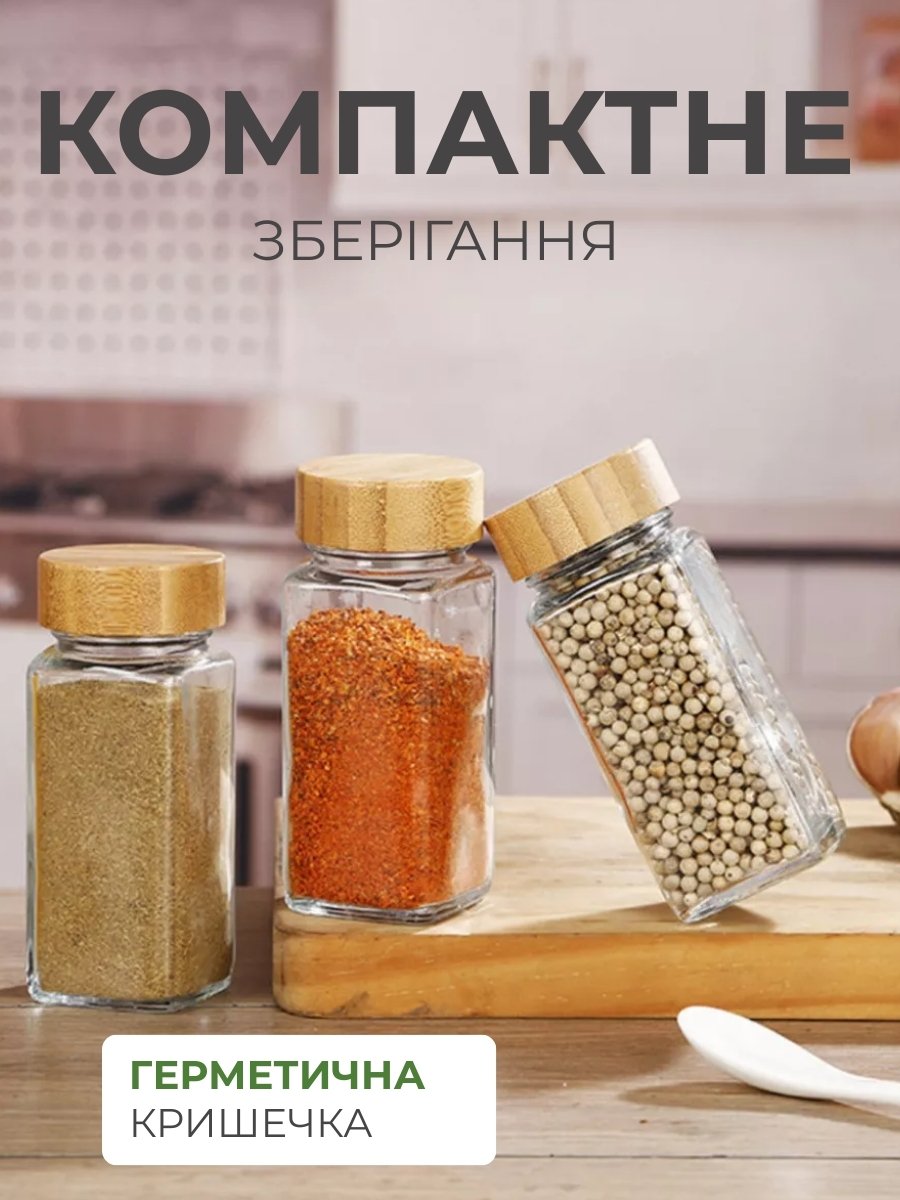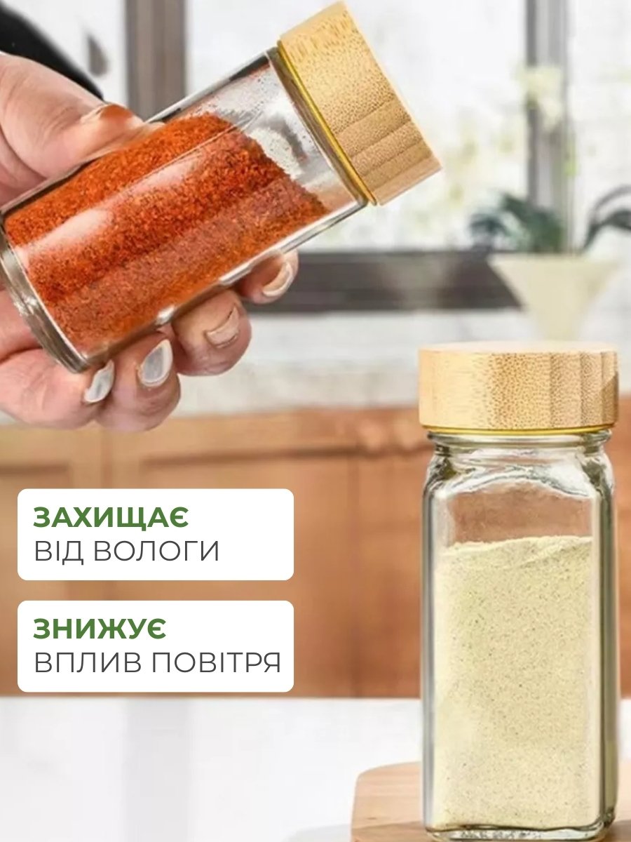 Набір баночок з бамбуковими кришками стане стильним рішенням на вашій кухні. Забудьте про те, що спеції втрачають свій аромат чи смак через нещільне зберігання.