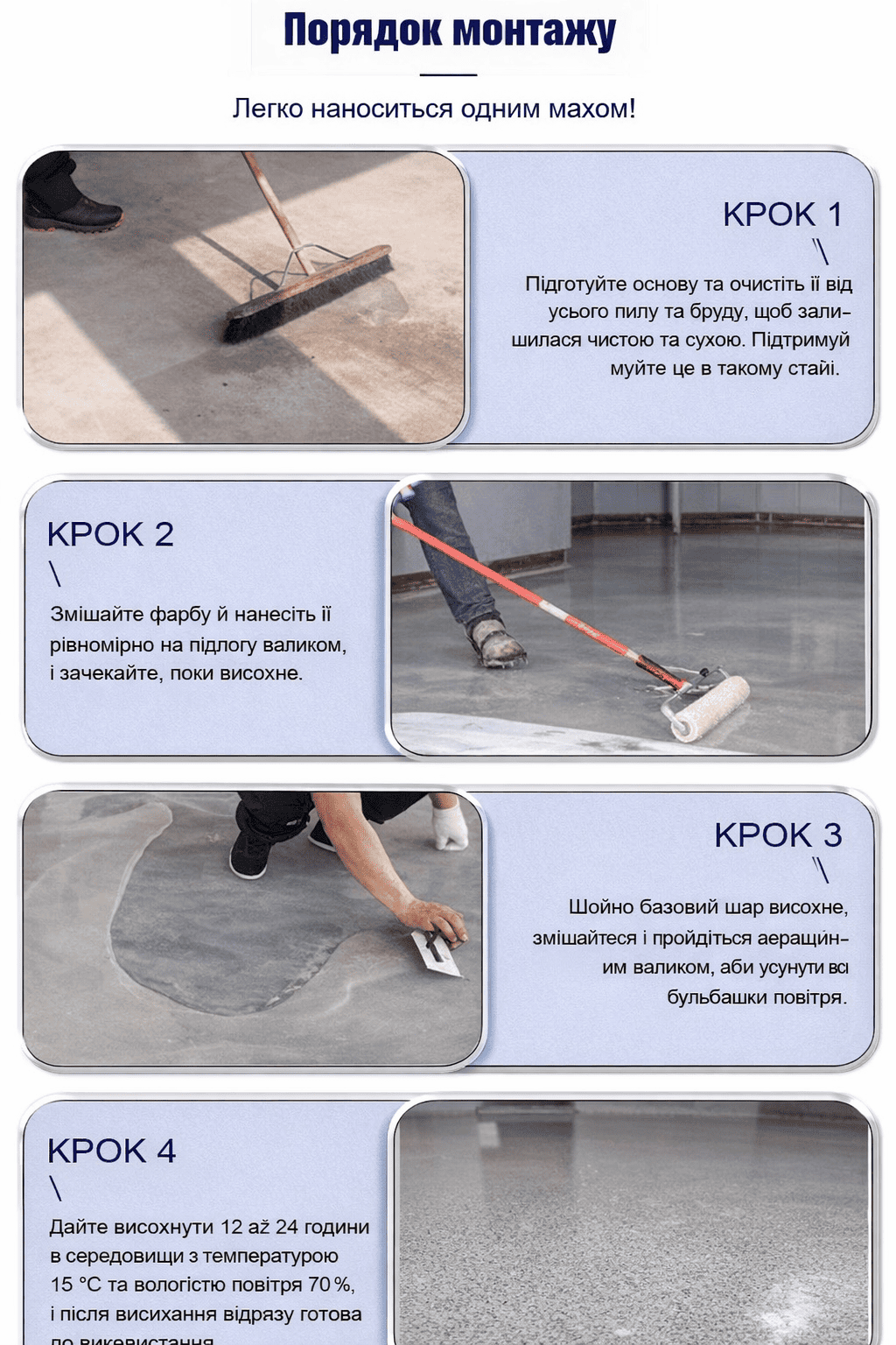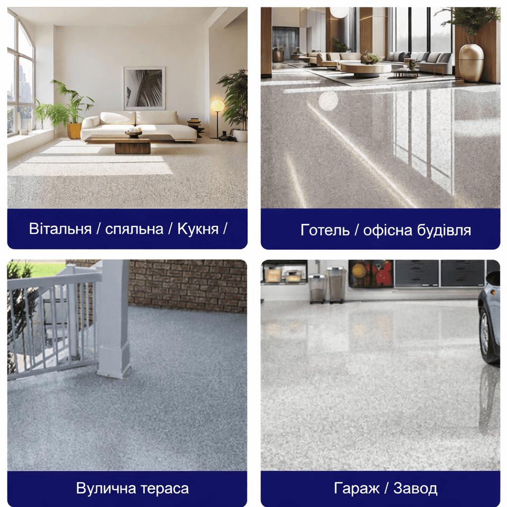 Саме тому її широко використовують у гаражах, складах, виробничих приміщеннях, комерційних об’єктах, житлових будинках та квартирах. Це практичне рішення для тих, хто хоче оновити стару підлогу без дорогого ремонту.