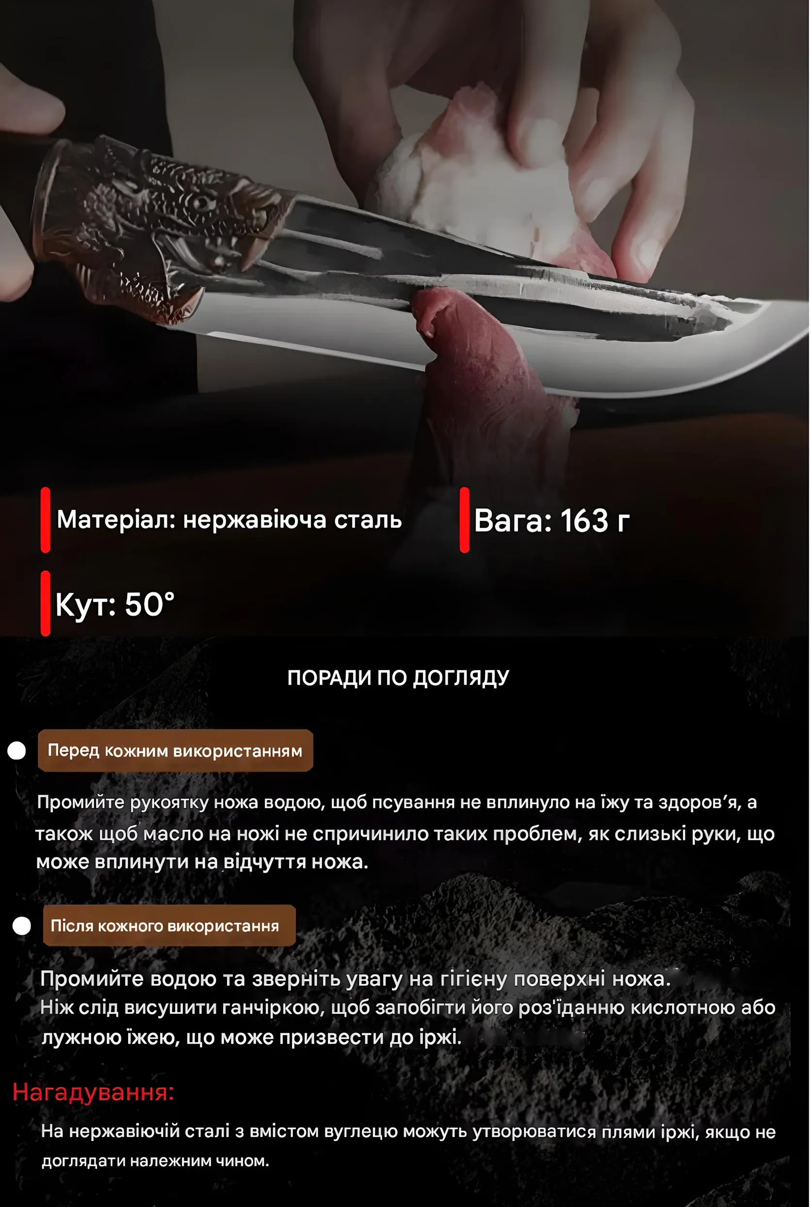 Декорована рукоятка у формі голови дракона робить ніж не тільки функціональним, а й стильним аксесуаром.