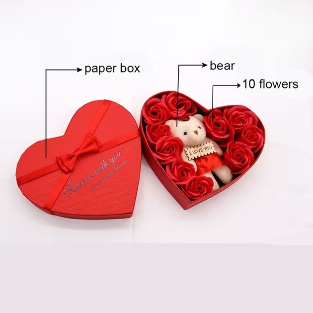 Останнє замовлення: 40 хв томуПодарунковий набір мильних троянд у формі серця з ведмедиком червоні