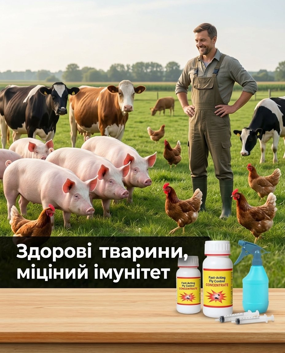 ЗДОРОВІ ТВАРИНИ — УСПІШНА ФЕРМА«Захист Ферми» не просто знищує шкідників — він підтримує і зміцнює здоровʼя ваших тварин. Зменшення кількості комах означає менше стресу, менше хвороб і, як наслідок, меншу залежність від антибіотиків. Ваші тварини будуть почуватися комфортніше, а їх продуктивність зросте. Не дайте цій унікальній пропозиції пройти повз вас — це шанс не тільки захистити, а й покращити життя вашої ферми та вихованців. Оберіть біологічне рішення вже сьогодні та відчуйте різницю!