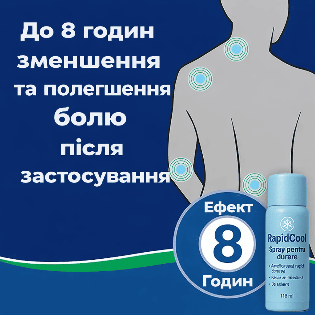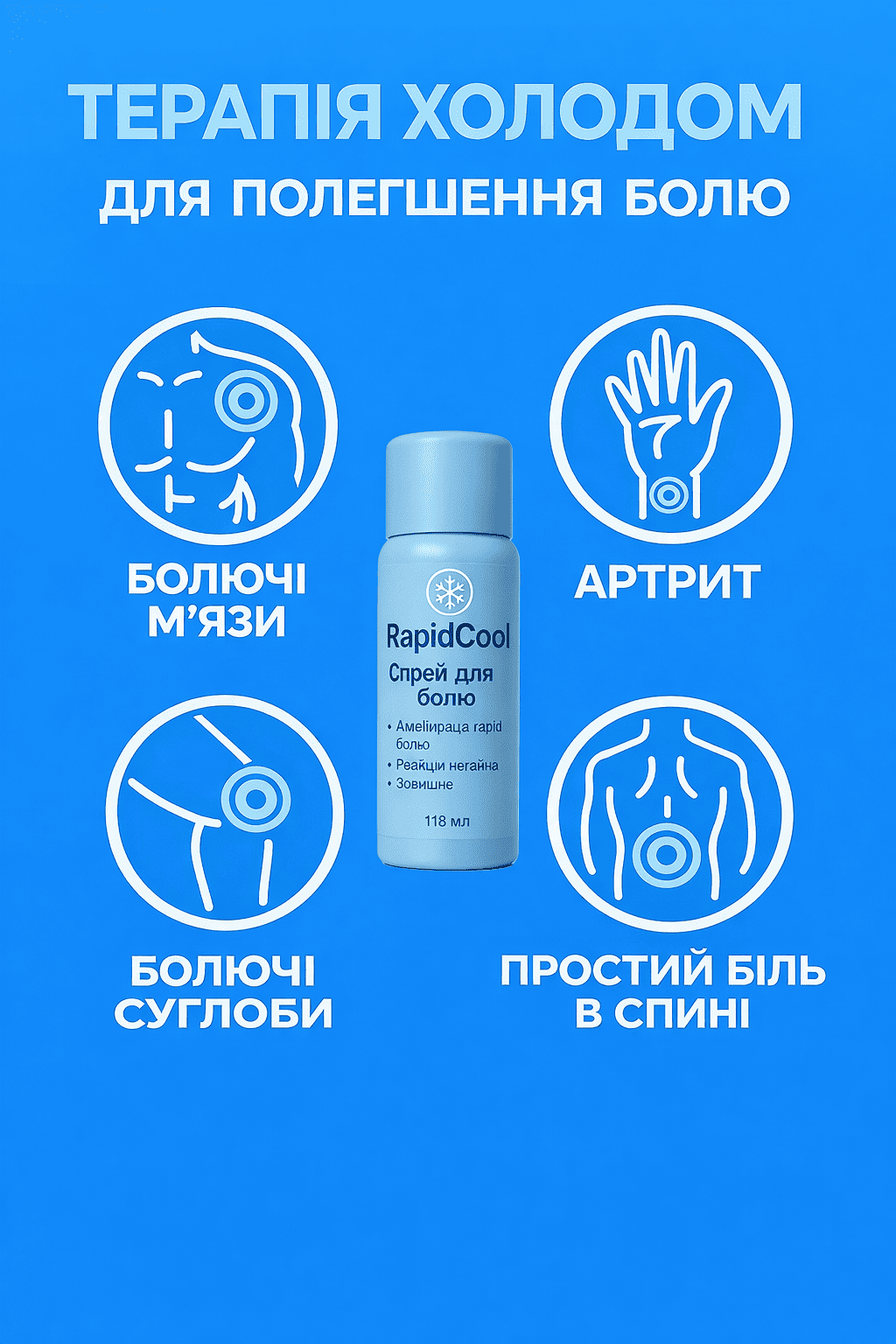 Більше не потрібні ліки чи жирні креми! RapidCool діє безпосередньо на шкіру, не проникаючи в організм. Просто розпиліть і відчуйте, як біль зникає.